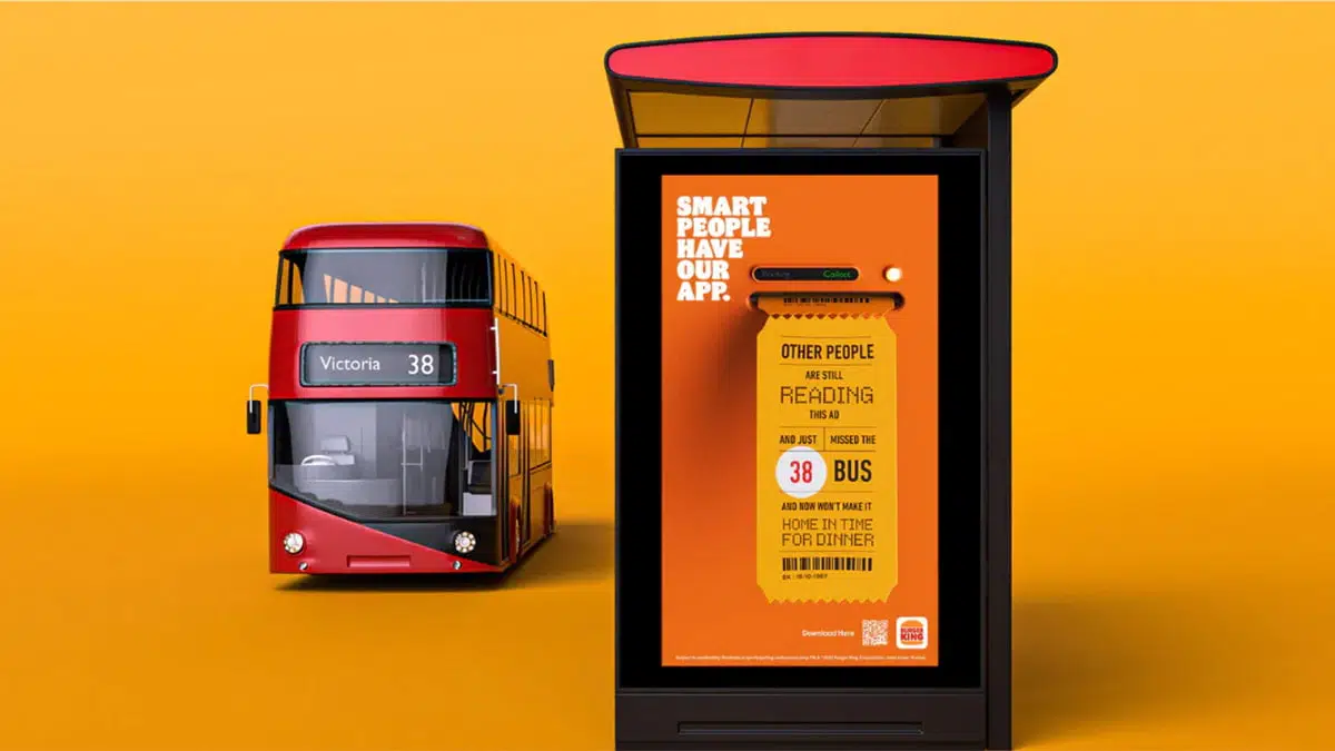 El primero de los anuncios, emplazado en una parada de autobús, hace hincapié en que otras personas, que no tienen la app de BK en sus dispositivos móviles, “están todavía leyendo esta publicidad, acaban de perder de bus y no llegarán a tiempo a casa para la cena”.