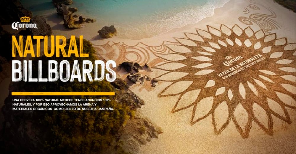Desde su lanzamiento, Cerveza Corona se ha caracterizado por generar mayor conciencia sobre el cuidado del medio ambiente y que las personas vuelvan a tener auténtica conexión con la naturaleza. Precisamente este es el mensaje que refuerza la campaña ‘Corona Natural’, una propuesta auténtica y disruptiva elaborada con elementos 100% naturales como arena, agua, piedras y plantas, que busca implementar, de una manera artística, paneles publicitarios hecho a base de materiales orgánicos.