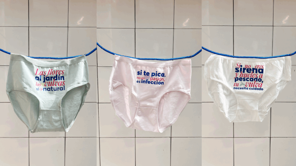 El público pudo leer mensajes directos como “Si te pica, no es pasión, es infección” o “Las flores al jardín, las vulvas al natural”, diseñados para que las mujeres pierdan el miedo a hablar sobre su bienestar íntimo.