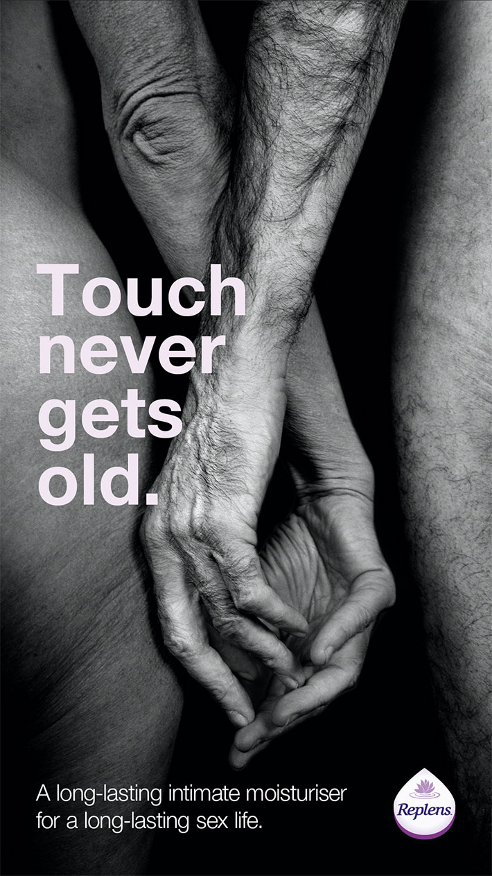 Los titulares de sus fotografías varían para mostear distintas experiencias y momentos en la intimidad, «el tacto nunca envejece», «la intimidad nunca envejece» son algunos de los encabezados que se leen en la premiada publicidad de Replens UK junto a la agencia marketera The Gate.