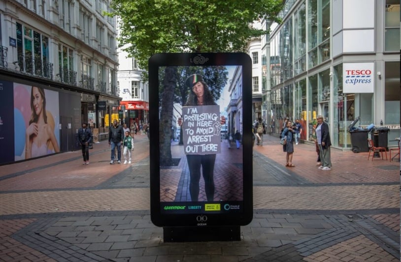 Frente a ello, la propuesta ha tomado las calles de Londres, Birmingham y Manchester, con vallas publicitarias de alto tráfico que incluyen un mensaje claro: “Estoy protestando aquí para evitar que me arresten allá afuera”. La frase, sostenida por activistas reales en los anuncios, pone en manifiesto las restricciones crecientes al activismo en espacios públicos.