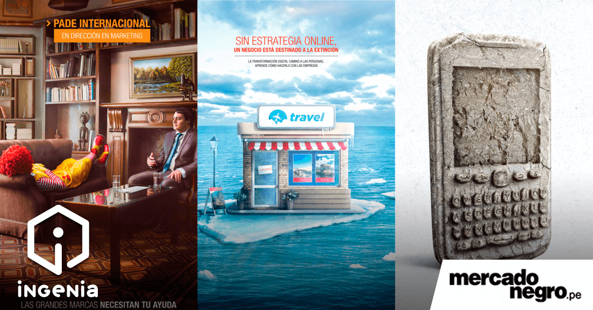 En el segundo afiche se muestra una pequeña tienda Travel, la cual está varado en un pedazo de hielo flotando en la Antártida acompañada de la siguiente descripción: “Sin estrategia online, un negocio está destinado a la extinción”, promocionando un curso de Marketing Strategy.