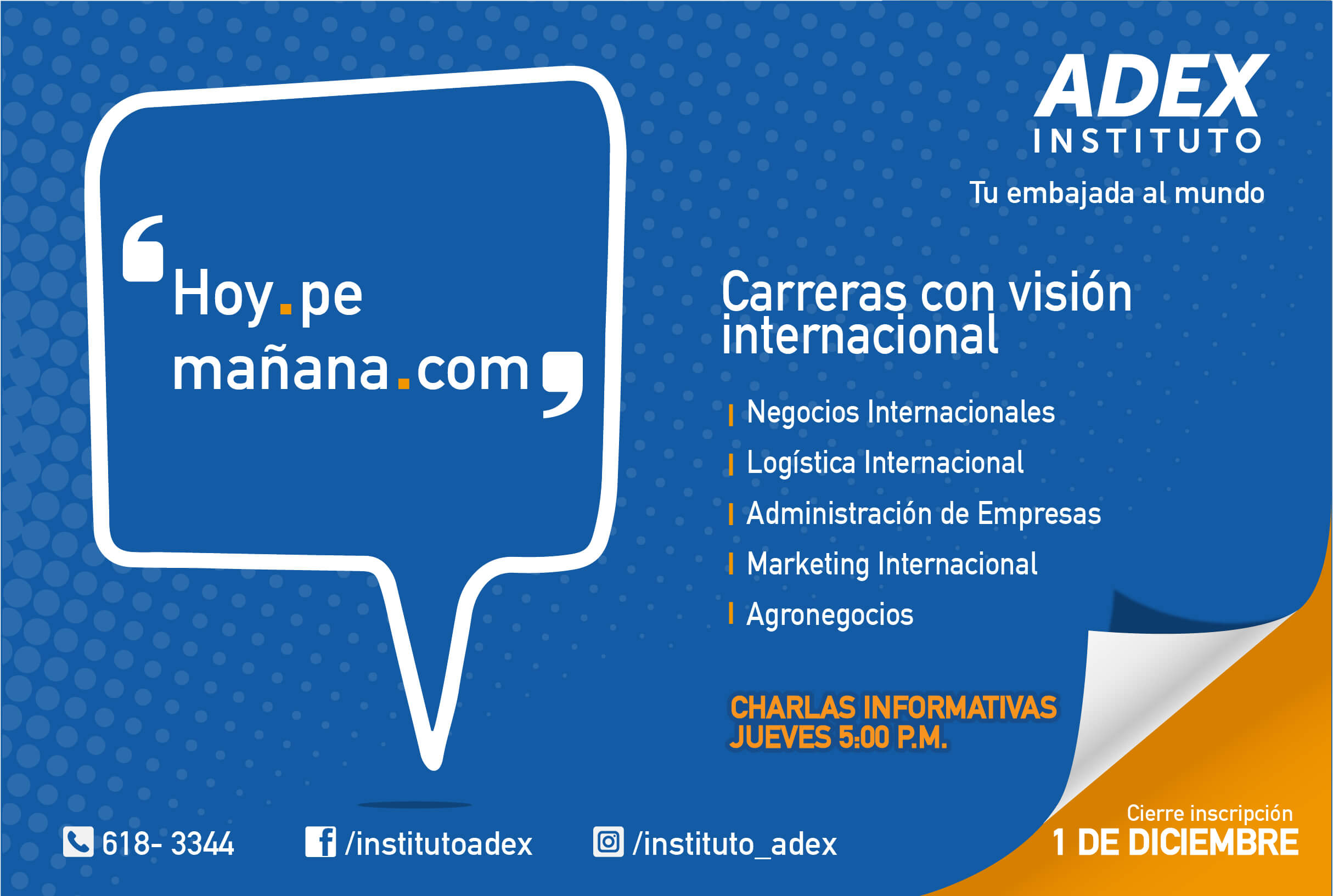 El objetivo de la campaña es resaltar que las carreras que ofrece Adex, abre posibilidades para aprovechar las oportunidades que se encuentran fuera del país, no solo en carreras con un enfoque centrado en el mercado local. Por ello, la empresa y la agencia debían diferenciarse ofreciendo carreras con visión internacional.