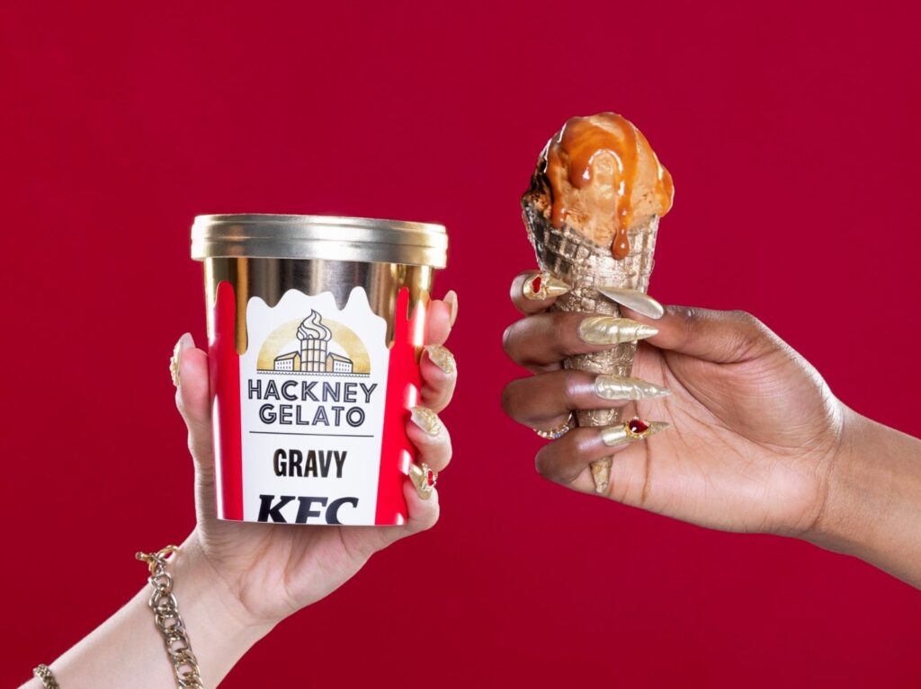 Además, otro de los aspectos que hacen atractivo el producto es su elegante packaging que, de acuerdo a las imágenes del portal web de KFC UK, viene en un envase con los colores emblema de la marca en la parte inferior y dorado en la parte superior, así como los logos de esta y de Hackney Gelato con el nombre del producto: Gravy.