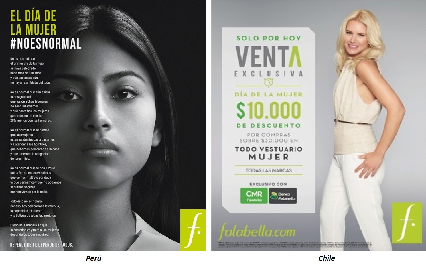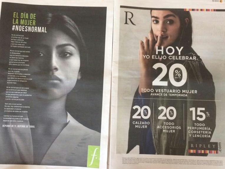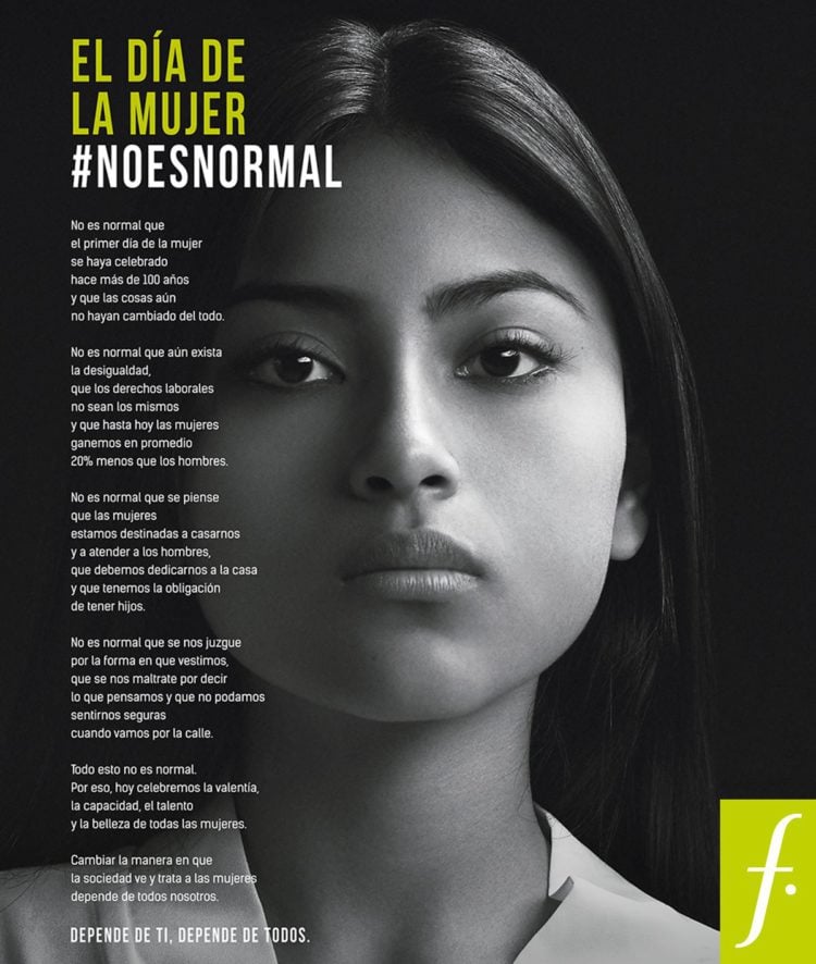 La compañía Saga Falabella de una forma original y realista, dio un mensaje totalmente distinto en el que nos dice mediante un anuncio la falta de oportunidades que pasan las mujeres día a día. Además, bajo el hashtag #NOESNORMAL, hace una fuerte reflexión sobre la falta de oportunidades, el maltrato físico y psicológico, el acoso callejero, la presión de la sociedad que obligan a las mujeres a vivir de manera presionada.