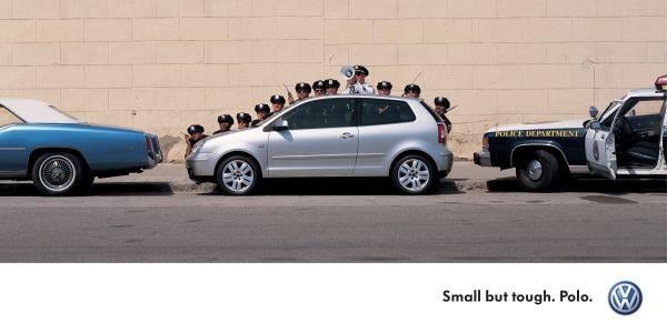 Volkswagen se ha caracterizado por tener una buena reputación gracias a la buena fabricación de autos y en ese sentido decidieron lanzar por esas fechas una campaña para el VW Polo, llamada “Pequeño, pero resistente». En el anuncio, podemos observar a un grupo de policías estadounidenses que se cubren detrás de un Volkswagen Polo mientras estaban en un asedio en una calle de Nueva York dejando de lado la patrulla de policías.