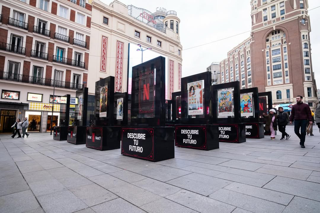 La propuesta, instalada en una concurrida plaza de Madrid, consta de 20 mupis que anticipan los próximos estrenos de la plataforma para este año.