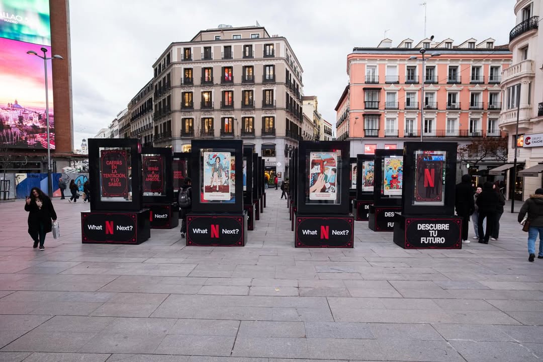 Netflix España ha desarrollado una nueva acción publicitaria para dar a conocer cuáles serán los estrenos en su plataforma este año. No obstante, la campaña resalta por el hecho de constar de 20 mupis, situados en una concurrida zona de Madrid, los cuales tienen apariencia de ser cartas de tarot.