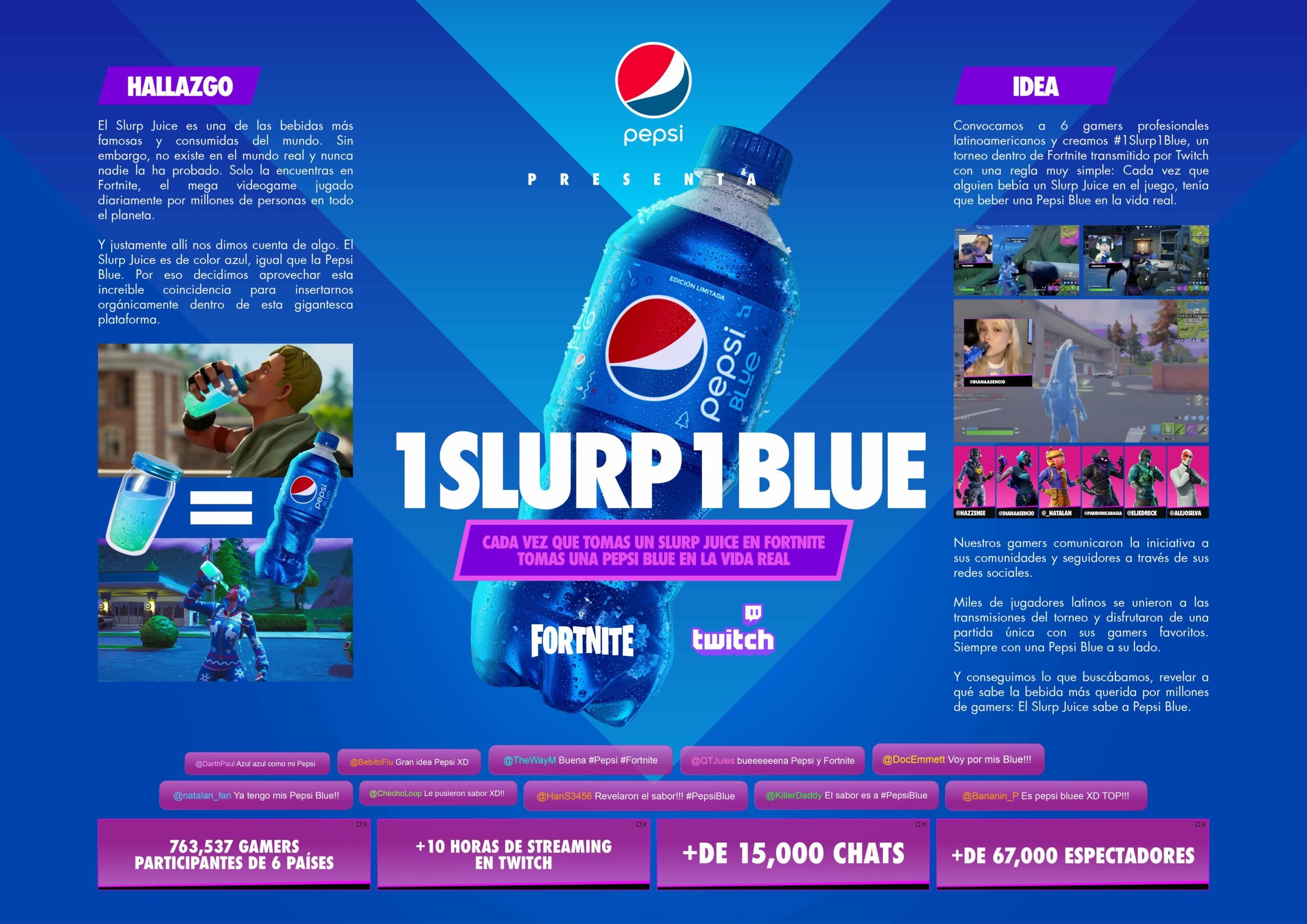 Después de 20 años, Pepsi decidió volver a lanzar Pepsi Blue en seis países estratégicos de América del Sur y el Caribe. Para dar a conocer el producto entre los más jóvenes, la agencia peruana RosadoToledo& lanzó #OneSlurpOneBlue, una campaña que se apoyó en el gaming para llegar a la generación Z y que ya ha cosechado grandes resultados.