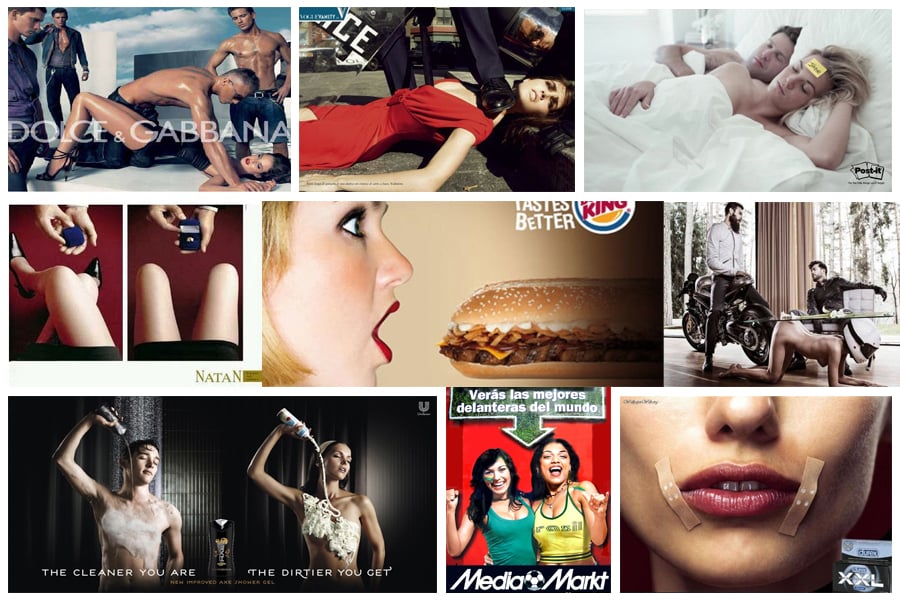 Algunos anuncios muestran a las mujeres como mercancía de uso diario o como un apetitoso platillo, tanto de forma figurada como literal.