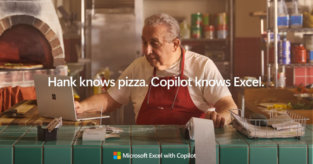 Además, el mensaje central se refuerza con las distintas frases que acompañan las escenas. “Hanks sabe de pizza. Copilot sabe Excel” o “Georgia sabe de bodas. Copilot sabe Word”, se lee en letras blancas en la parte central de cada imagen.