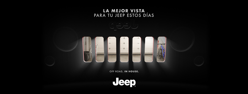 En una auténtica pieza gráfica trabajada por la agencia de publicidad Mood, Jeep Perú muestra la vista desde dentro que tienen sus vehículos en casa. El recurso creativo está en que esta vista se logra gracias a la luz que entra por la parrilla de ranuras (un pilar de diseño de la marca). Es así que se logra divisar el ambiente de una cochera, transmitiendo firmemente el #QuédateEnCasa, que demanda un cambio de hábito, sobre todo en los fieles seguidores de la marca, conocidos como ‘Jeeperos’.
