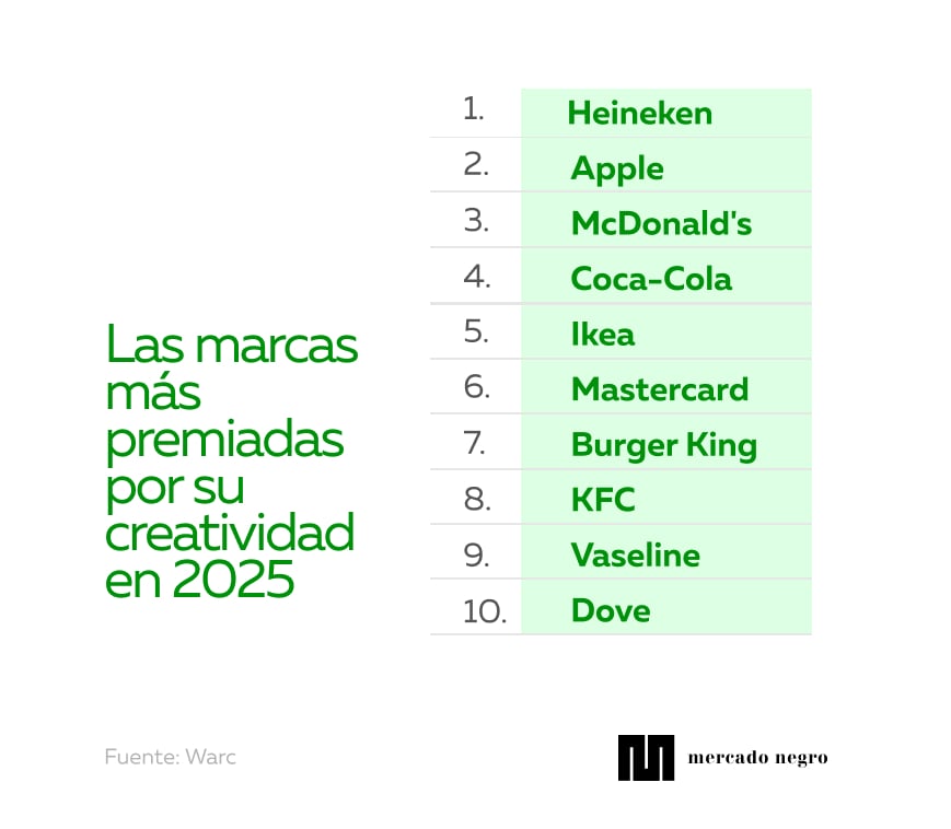 Dentro de las marcas más premiadas por su creatividad en 2025, Heineken ocupa el primer puesto, luego de ser parte de las 10 mejores marcas durante los últimos cuatro años y haber quedado segunda en la última edición. La empresa cuenta con dos campañas en el top 100 y otras 19 campañas en la base de datos completa de “Creative 100”, procedentes de 12 países diferentes.