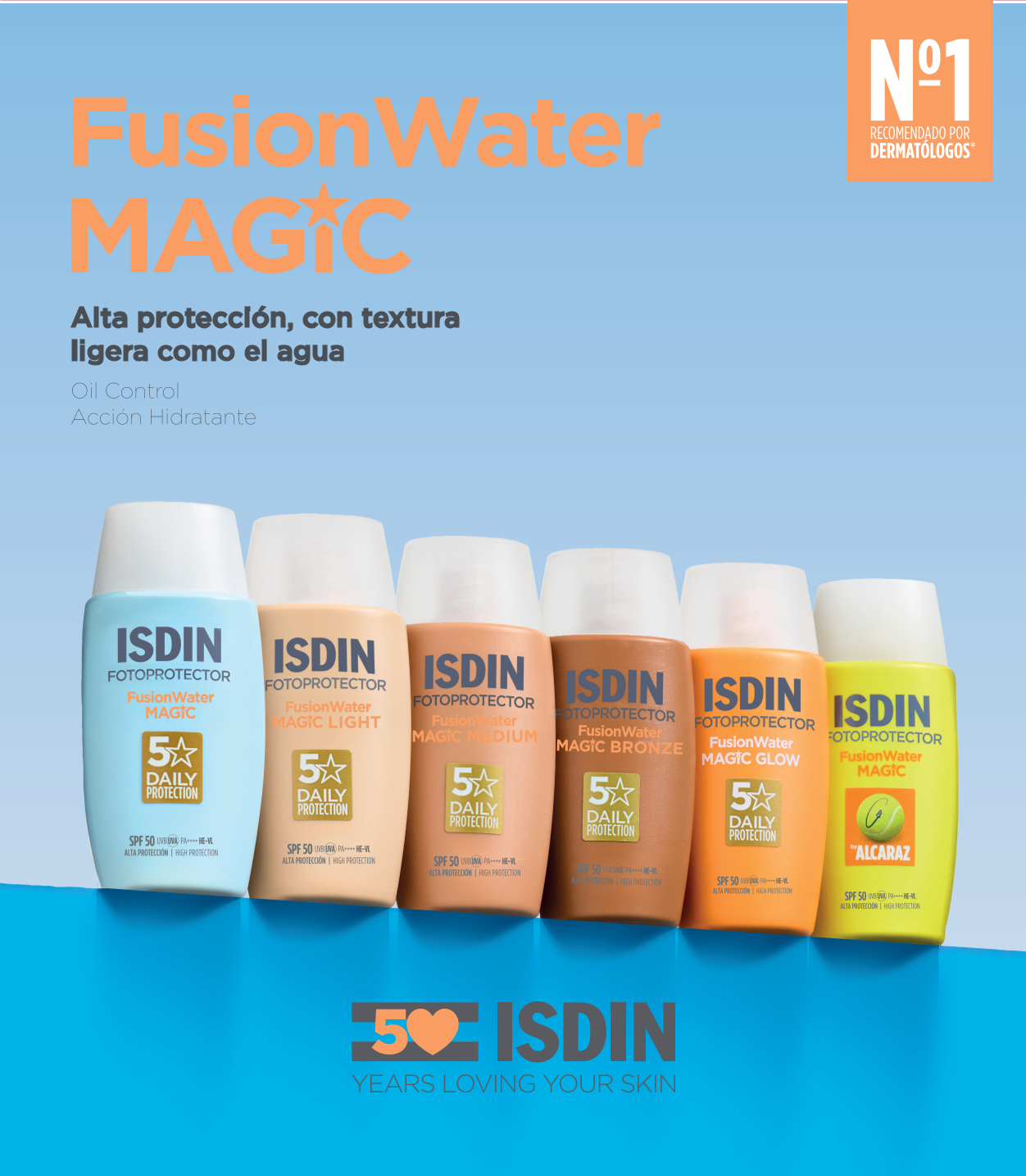 Como parte de su propuesta, ISDIN cuenta con un portafolio de fotoprotectores pensado para distintos tipos de piel y estilos de vida. Entre ellos destaca Fusion Water Magic SPF 50, una fórmula de textura ultraligera que ayuda a controlar la oleosidad, ofrece hidratación prolongada y está diseñada para no irritar los ojos.