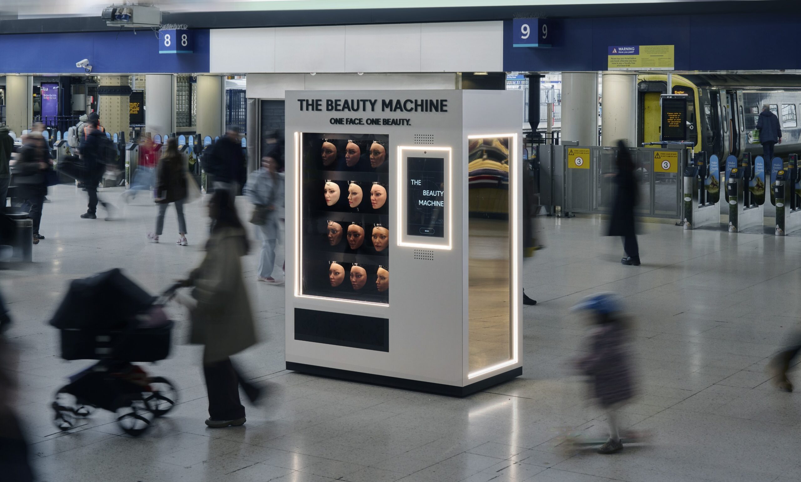 La propuesta creativa se materializa con «The Beauty Machine», una instalación ubicada en la estación Waterloo en Londres. El dispositivo funciona como una metáfora visual del comportamiento de las plataformas digitales, ya que aunque aparenta mostrar diversidad, termina repitiendo el mismo tipo de rostro una y otra vez.