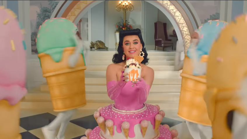 “Noche de sushi y una peli cursi”, dice Perry sentada en el sofá con sus perros viendo lo que sucede en la pantalla. “Y un helado de café para esta California Girl”, apunta más adelante.