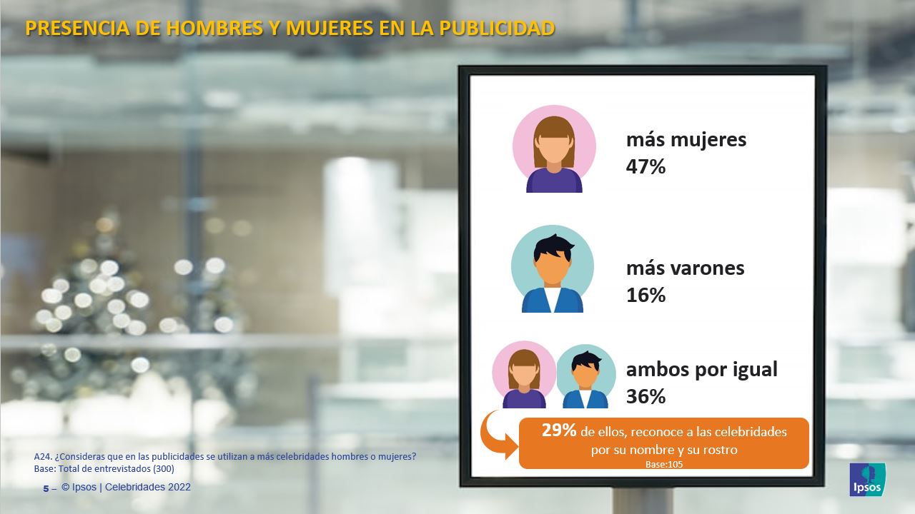 Presencia del género femenino: existe una percepción generalizada de que hay una mayor participación de mujeres en la publicidad en comparación con la de hombres. Esta tendencia podría estar influenciada por diversos factores culturales y sociales, así como por la creencia de que ciertas categorías, como la belleza, son mejor representadas por líderes de opinión femeninas. Sin embargo, es importante considerar la diversidad y la igualdad de género al seleccionar íconos sociales para evitar estereotipos y promover una representación equitativa.