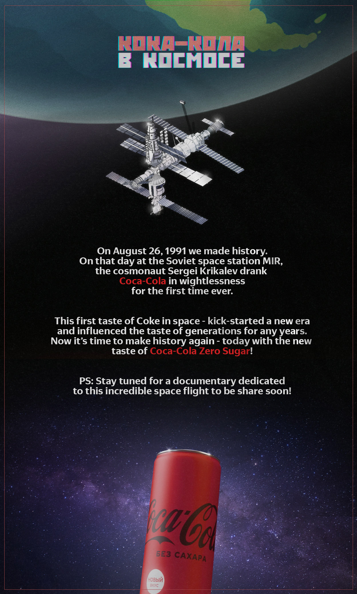 McCann Moscú y Coca Cola Rusia tienen una gran relación desde hace mucho tiempo. El cliente nos contó que estaban pensando lanzar un nuevo sabor al mercado, Coca Cola Zero Azúcar, por tal motivo necesitaban un gancho que no venda solo este nuevo sabor, también buscan un mensaje que haga vibrar los cimientos de la cultura Rusa. Especialmente porque los rusos son muy patriotas y respetuosos de sus logros, quisimos ir un paso más allá y hacer algo único, colorido y con la insignia de Coca Cola. Y, casualmente, los últimos días de agosto se celebra el día de los cosmonautas.