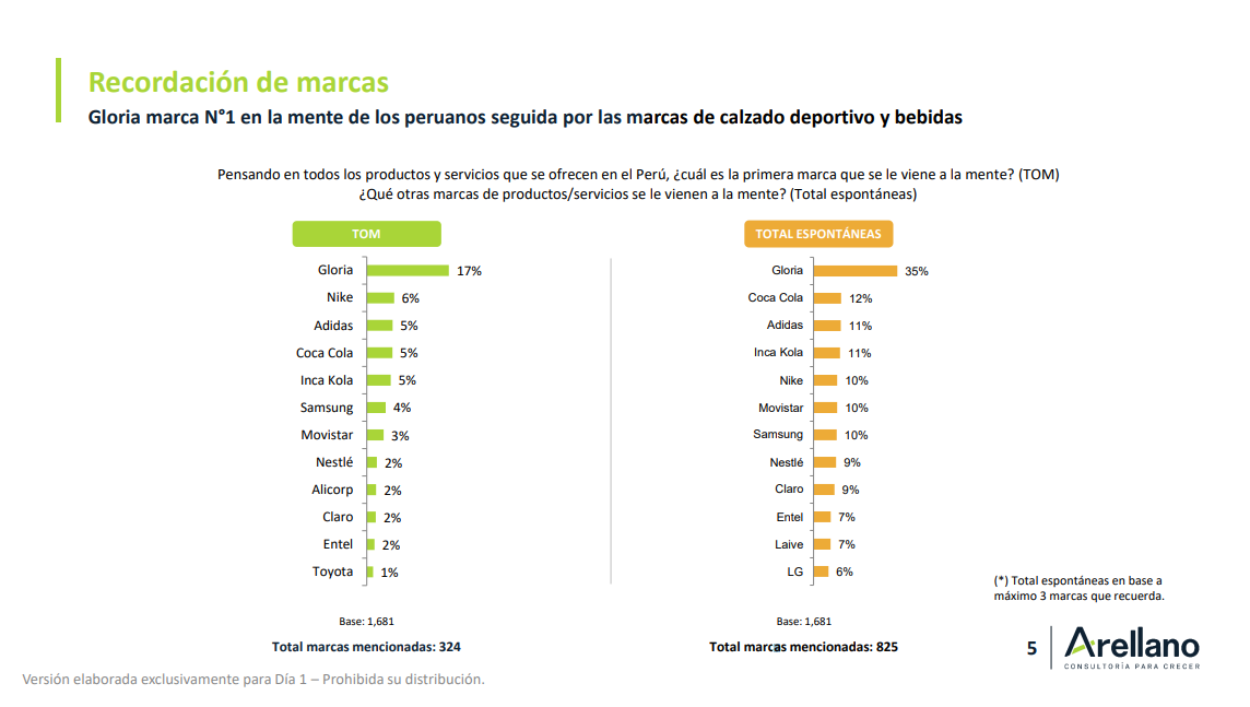 —Leche Gloria, a lo largo de las mediciones que Arellano Consultoría viene realizando cada año, aparece como la marca más recordada por el público objetivo. Esto se atribuye a los años de permanencia en el mercado como una marca peruana importante. Asimismo al competir en categorías de consumo masivo en las que el contacto con el consumidor es constante y tener una buena inversión en comunicación hacen que aparezca en esta posición destacada. Un trabajo importante que ha venido logrando en el tiempo.