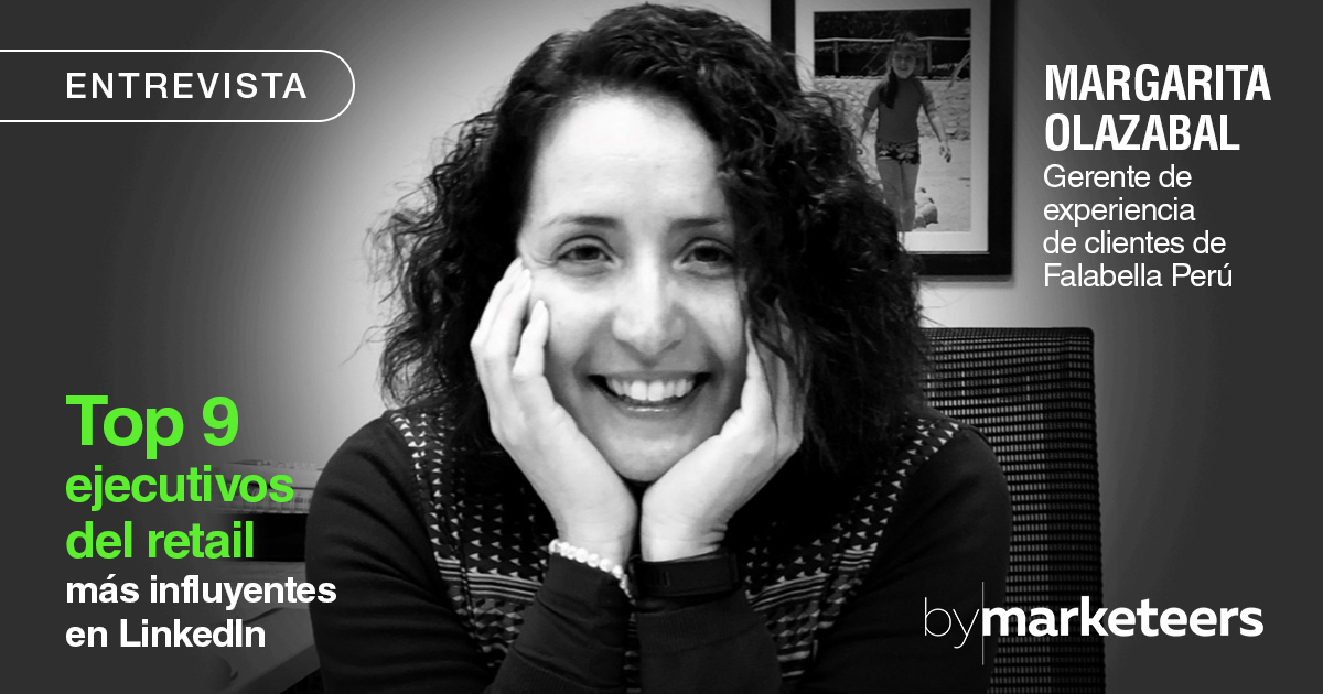 Margarita Olazabal es Gerente de experiencia de clientes de Falabella Perú. Este mes logró ubicarse en el noveno puesto del Top 9 de Ejecutivos del Retail más Influyentes en LinkedIn publicado en el segundo número de la revista ByMarketeers, producto editorial de Mercado Negro Advertising.