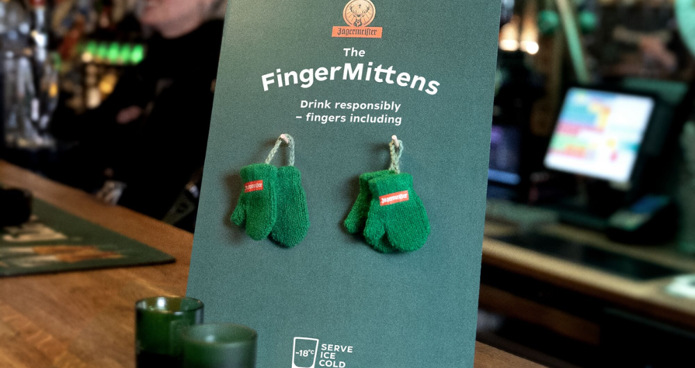 El corazón de la campaña son unos pequeños mitones tejidos para los dedos, un objeto tan inesperado como memorable. Su función resulta simple y casi absurda al permitir sostener un shot helado sin que los dedos sufran. Ese gesto exagerado comunica mejor que cualquier aviso publicitario que el licor debe servirse bien frío.
