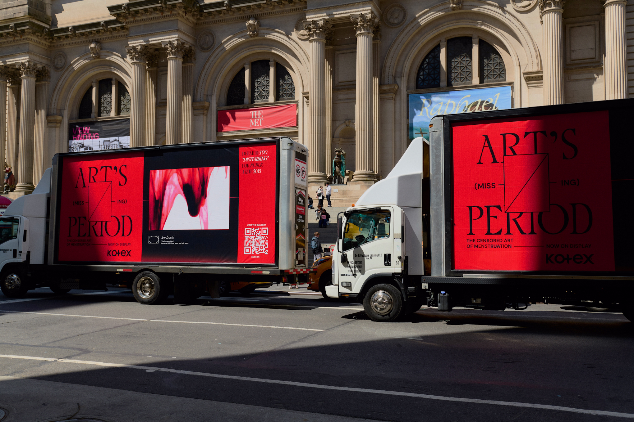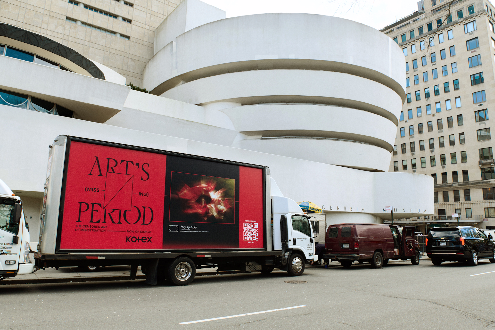La campaña de Kotex despliega piezas OOH cerca de museos y espacios culturales para llamar la atención sobre aquello que tradicionalmente no se muestra dentro de las instituciones artísticas. Cada instalación incluye códigos QR que conducen a una galería digital donde el público puede explorar más de 40 obras relacionadas con la menstruación. Asimismo, la plataforma digital permanecerá activa durante un año y busca ofrecer un espacio permanente para artistas cuyas obras han quedado fuera de circuitos tradicionales.