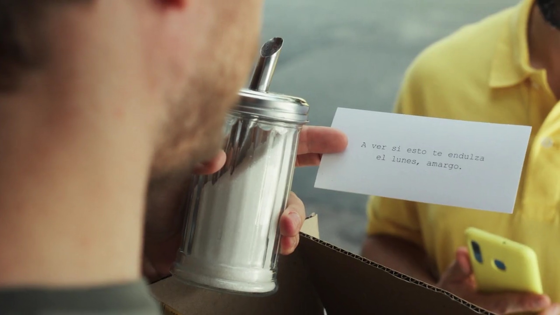La pieza se embarca en la historia de Matías y Rodrigo, dos amigos que deciden burlarse – entre ellos – cada que un partido va para mal, enviándose productos disponibles en el e-commerce, acompañados de mensajes en tono sarcástico. Desde un azucarero con la frase “A ver si esto te endulza el lunes. Amargo”, un chupón de bebé o hasta una jaba de huevos, son algunos de los insólitos artículos que se hacen llegar el uno al otro.