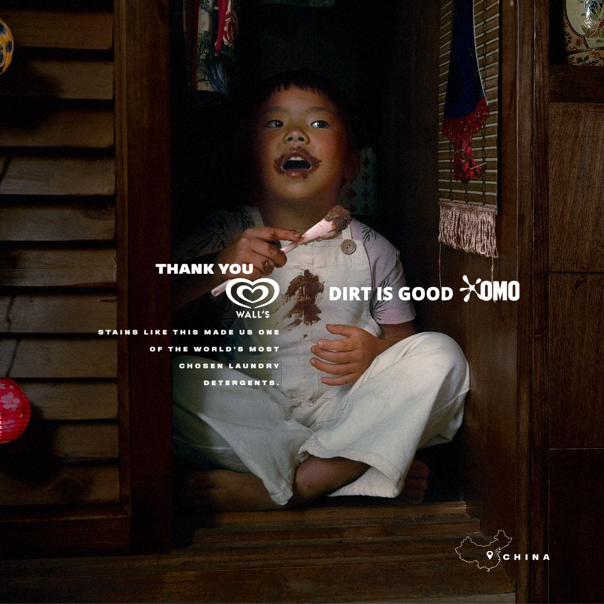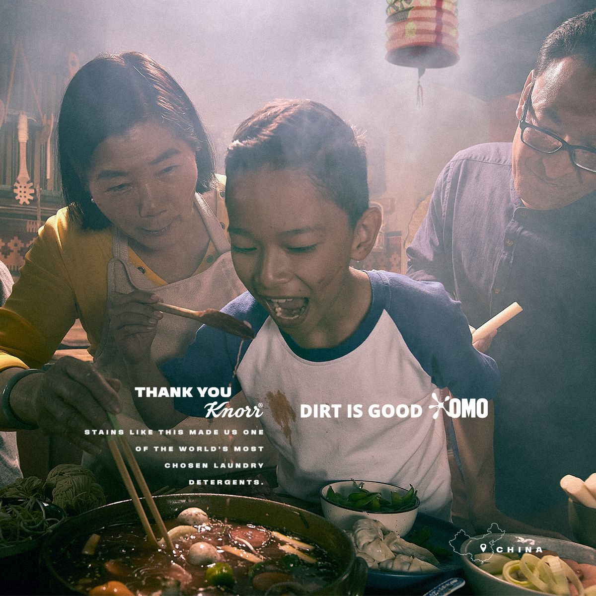 Bajo el lema “Dirt is Good” («La suciedad es buena»), la firma de Unilever les agradece a otras marcas por ser generadoras de manchas en la ropa de los usuarios. Hellman’s, Cornetto, Knorr, Wall’s son algunas de las firmas a las que Omo alude en su creatividad. Todas las marcas mencionadas forman parte del grupo Unilever.