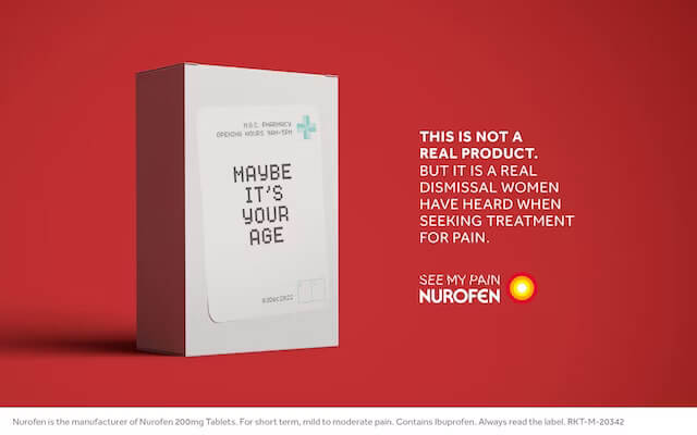 La marca de analgésicos Nurofen ha decidido hablar de la brecha de género en el dolor en su última campaña. En la serie se resalta lo que las mujeres han oído decir a familiares, amigos y profesionales de la salud cuando expresan su dolor. “Quizá sea tu edad» y «Estás siendo dramática» son algunas de las frases que se pueden leer en los frascos.