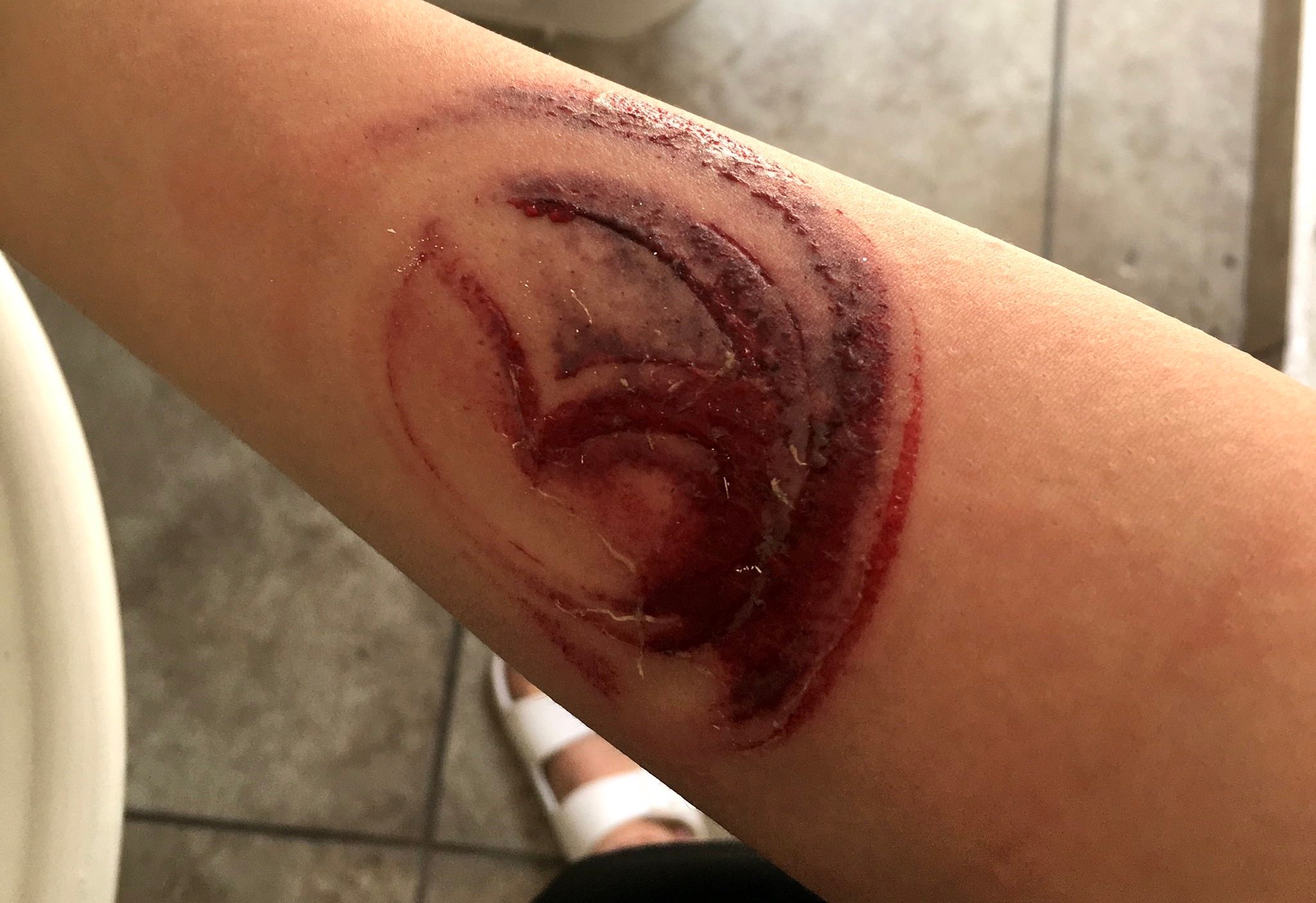 La imagen compartida junto al Tweet muestra el brazo de la mujer con un gran hematoma en forma del logo del fabricante de automóviles japonés, y por el cual la afectada pide un patrocinio.