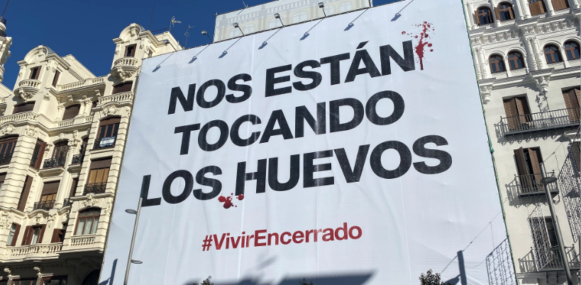 «Nos están tocando los huevos», es la contundente frase impresa en una lona de la Gran Vía madrileña con la que la ONG Igualdad Animal ha querido llamar la atención estos días, para denunciar el maltrato que sufren las gallinas en España. Una campaña teaser que, bajo el hashtag #VivirEncerrado, desvela un dato estremecedor.