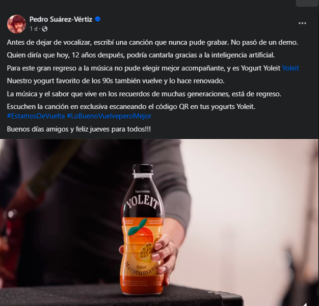 Pedro Suárez-Vértiz compartió su entusiasmo en sus redes sociales, escribiendo: «Antes de perder la capacidad de cantar, escribí una canción que nunca pude grabar; solo quedó en forma de demo. Quién hubiera imaginado que, 12 años después, podría interpretarla gracias a la inteligencia artificial. No podría haber elegido un mejor compañero para este esperado regreso a la música que Yoleit, nuestro yogurt favorito de los años 90, que también ha vuelto renovado».