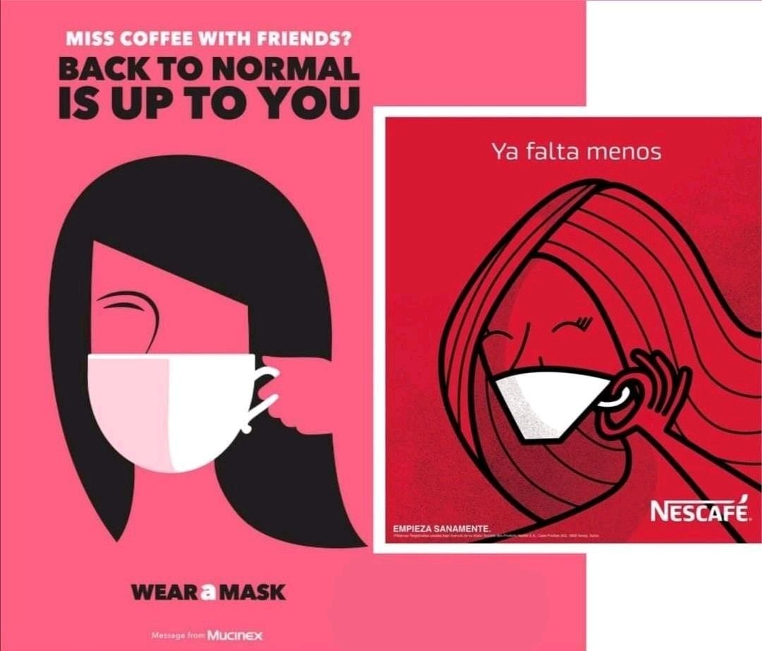 En el caso del anuncio que es igual (y previo) al de Nescafé, este habla de los cafés que por ahora no pueden tomarse entre amigos. Otras piezas de la misma serie usan como mascarilla un regalo, haciendo alusión a las fiestas de cumpleaños, o un barco, haciendo alusión a los cruceros y las fiestas en yate.