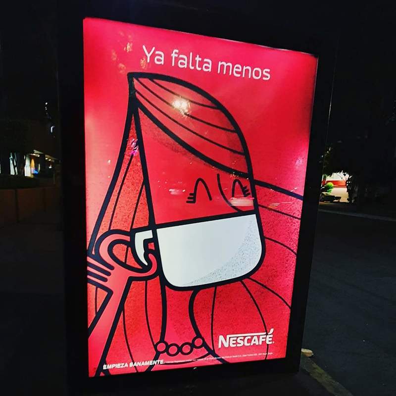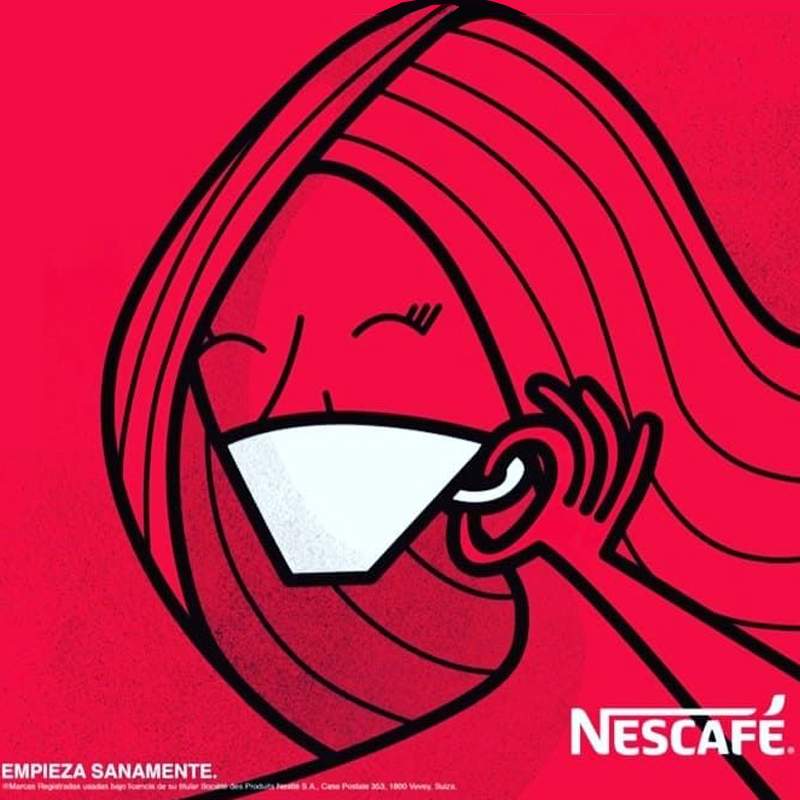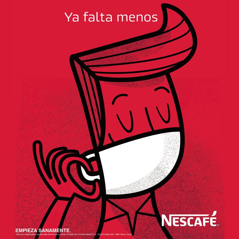 El arte de Nescafé muestra, en varias versiones, una caricatura en la cual un personaje se acerca al rostro una tasa de café blanca que al mismo tiempo parece ser una mascarilla. La pieza está acompañada del texto «Ya falta menos», haciendo alusión a un próximo fin de la emergencia sanitaria gracias al avance de la vacunación.