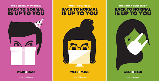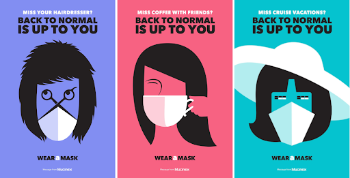 La pieza gráfica llama a usar la mascarilla de la misma manera que hace un año lo comunicaba Mucinex, una marca de medicamentos de Estados Unidos. ¿Crees que se parecen? Mira las dos gráficas en esta nota.