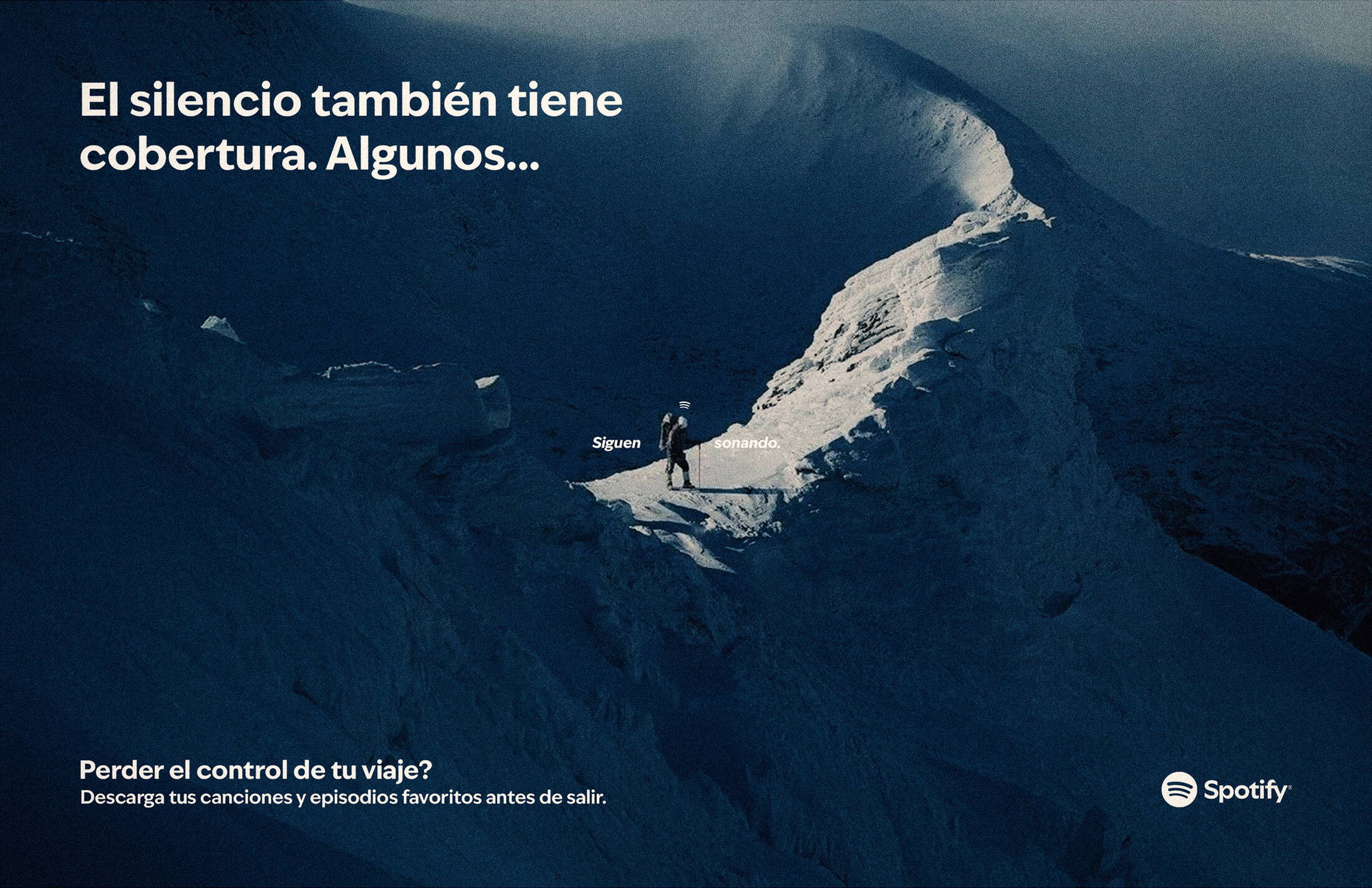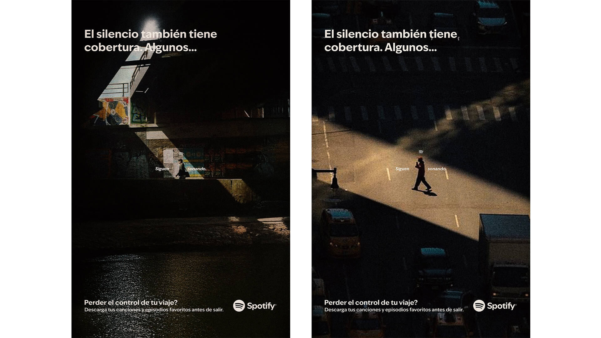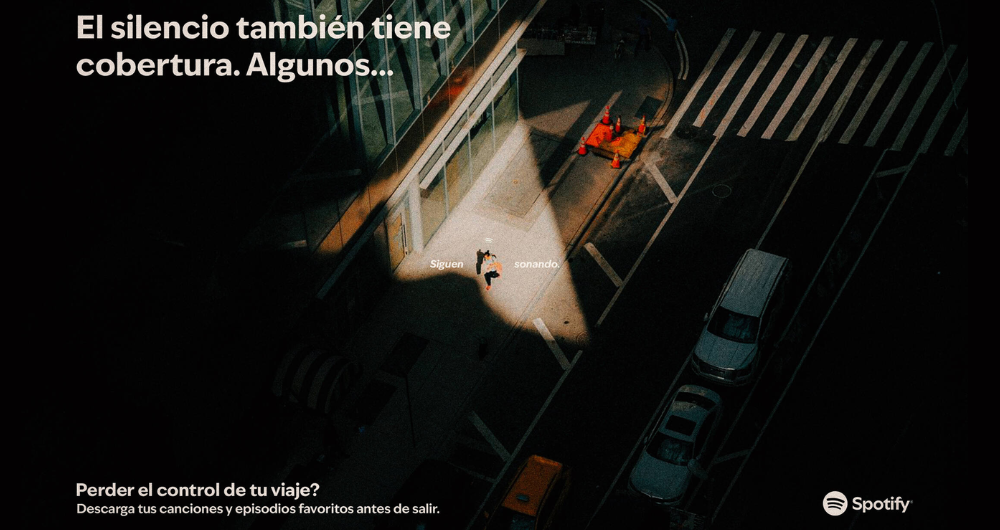 La idea parte de una observación simple: las interrupciones en la conectividad afectan la experiencia musical y rompen el flujo emocional del viaje. A través de un concepto visual que utiliza las sombras como metáfora de esas pausas inevitables, la pieza invita a ver en Spotify Premium una herramienta que permite atravesar las «zonas de sombra» y mantener la música encendida sin depender de la señal.