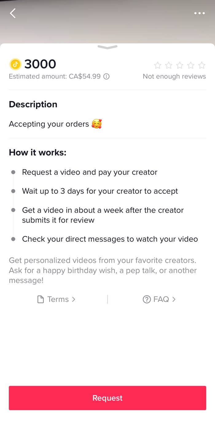 Hasta ahora TikTok no ha aclarado cuántos seguidores se necesitan para poder activar esta función. El video llega al usuario a través de un mensaje directo, luego de ser revisado por la plataforma antes de su envío. El proceso no debería tener una duración mayor de una semana, luego de que la celebridad suba el video al sitio para revisión.