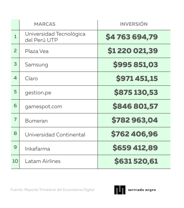 Según el Reporte Trimestral del Ecosistema Digital, estas son las 10 marcas con más inversión publicitaria digital en el Perú durante el último trimestre del 2025: