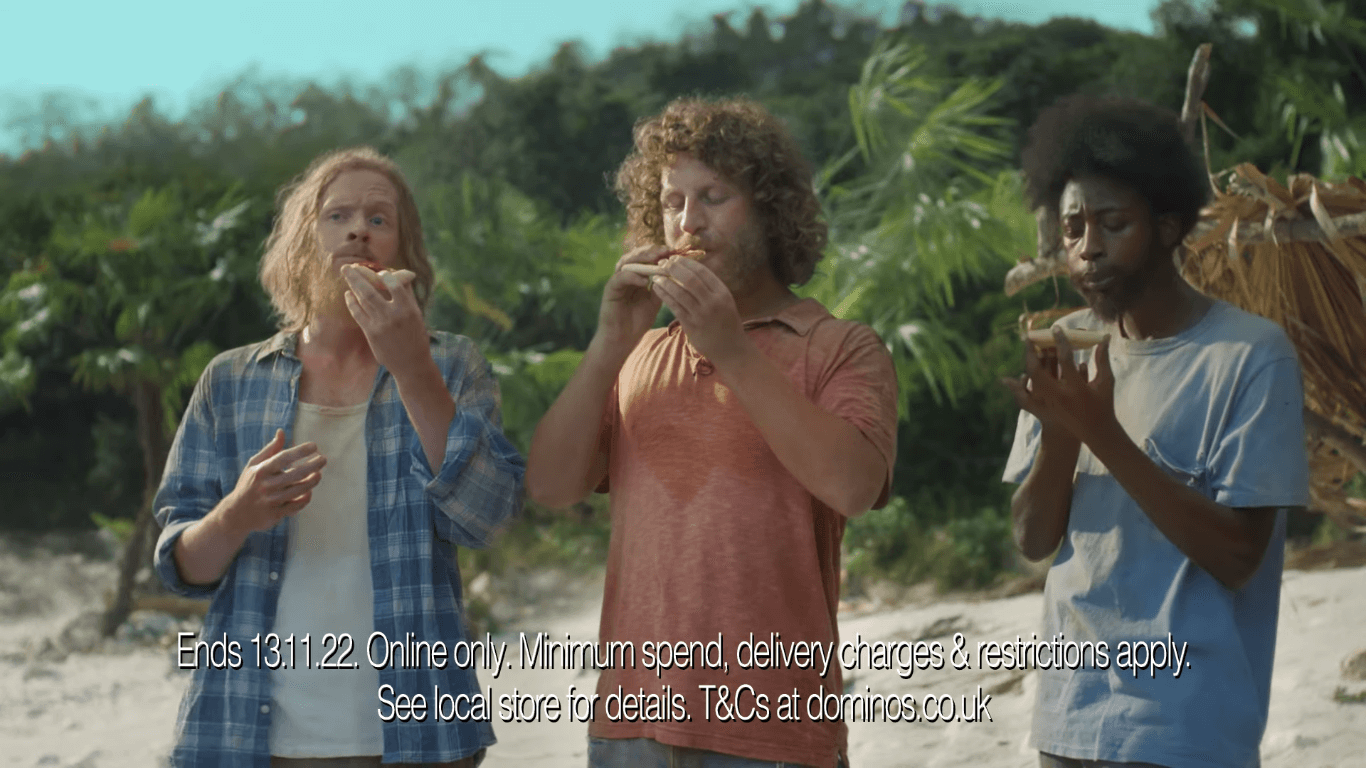 Como el conductor vuelve a su moto de agua, los náufragos están tan enamorados de su deliciosa pizza de Domino’s que van a perder su posible ruta de escape de la isla abandonada. El anuncio termina con el eslogan de la campaña de marketing de Domino’s «Pizza irresistible con un irresistible 50% de descuento».