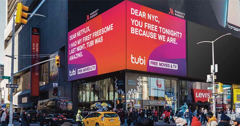 La plataforma Tubi resalta su servicio gratuito en su primera campaña de publicidad exterior.