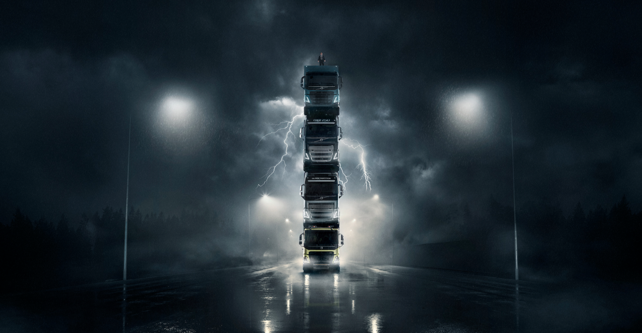 Calificado como el lanzamiento más importante de Volvo hasta la fecha, la nueva campaña de la marca automovilística presenta de forma impresionante y audaz cuatro camiones apilados unos sobre otros, mientras el presidente de Volvo Trucks, Roger Aim, se muestra orgulloso en la cima.