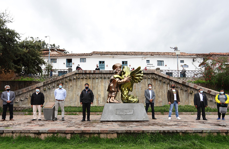 San Blas ya no se siente vacía. A pocos metros de los artesanos que hacen vida en la barriada de artistas de la Ciudad de Cusco, se levanta una escultura de 2m de altura, modelada en arcilla con acabados de oro y cobre. La pieza devela el abrazo de dos personajes de universos distintos, erigidos sobre un pedestal de 80 cm: Varayoc y Lanfranco, dos alusiones a la comunidad andina y su mágica cosmovisión, que se entrelazan para exponer el mal estado del rubro artesano de la plaza San Blas, inactiva desde la inusitada pandemia.