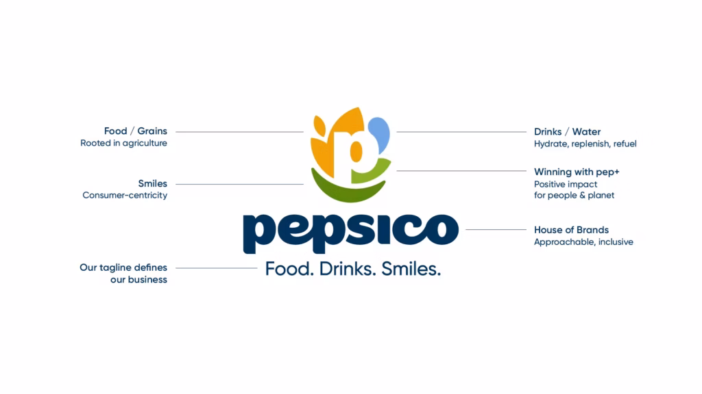El nuevo logo reemplaza la esfera multicolor que acompañaba al nombre desde 2001 por un escudo temático que forma la letra “P” a partir de una sonrisa, acompañado de un grano y una gota de agua, símbolos que representan snacks y bebidas. La sonrisa refleja el enfoque en el consumidor y la misión de generar más sonrisas con cada producto.
