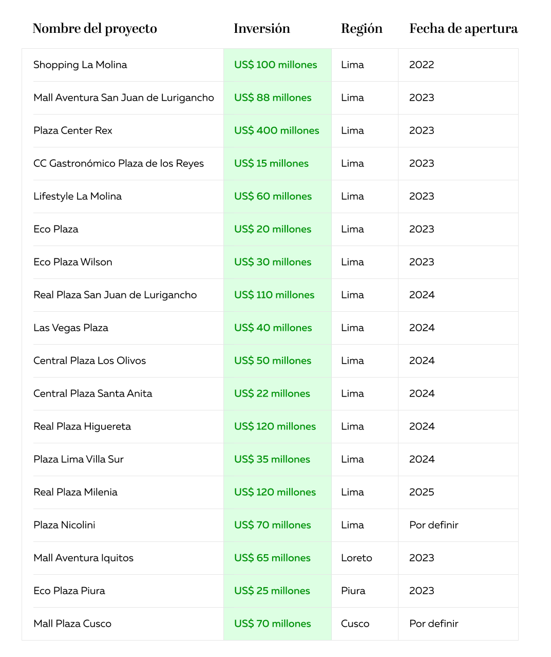 En provincias resalta la entrega en 2023 del primer y único mall en la Amazonía peruana, con la marca Mall Aventura Iquitos de US$65 millones. También figuran el Mall Plaza Cusco (US$70 millones) y Eco Plaza Piura (US$25 millones).