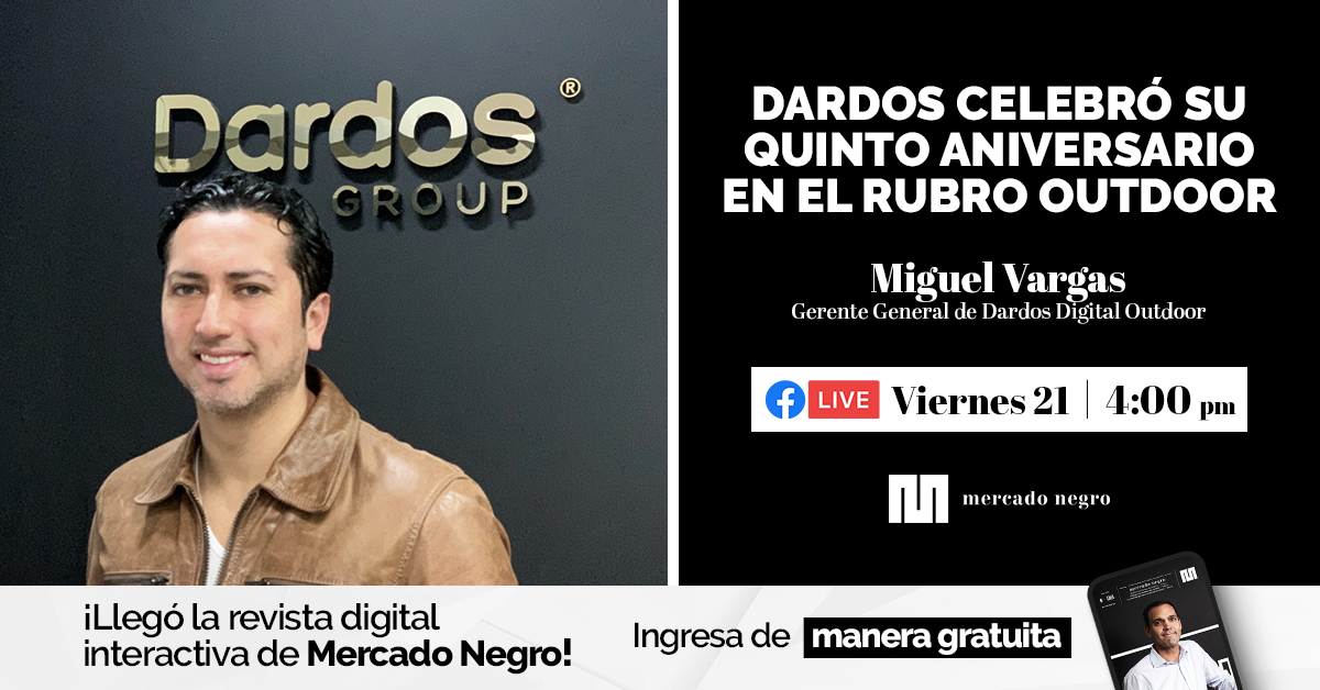 Mercado Negro contactó el pasado lunes 17 de agosto con Miguel Vargas, gerente general de la empresa de publicidad exterior Dardos, para hablar sobre la evolución de la compañía desde su nacimiento, su propuesta de valor frente al contexto actual y nuevos retos en el sector.