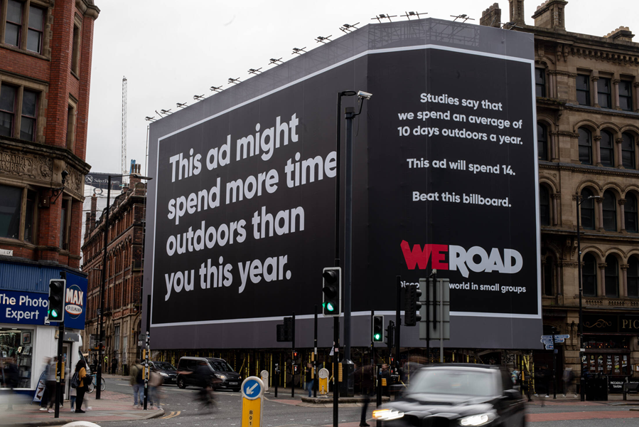 Un anuncio destaca que los británicos promedio solo pasan 10 días al aire libre al año. La agencia de viajes WeRoad y la agencia creativa Dude desafían a los transeúntes a cambiar esta realidad