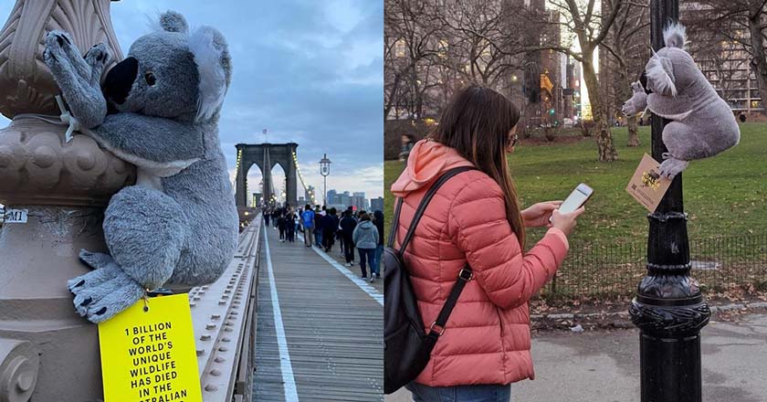 Se trata de “Koalas en Nueva York”, iniciativa que consiste en la aparición de peluches de estos marsupiales típicos de Australia, que están abrazados a farolas, semáforos y árboles. Aproximadamente 100 peluches fueron colocados por los trabajadores de la agencia el día viernes 10 de enero en las ciudades con mayor tránsito de Nueva York, como Washington Square Park, Times Square o Grand Central.