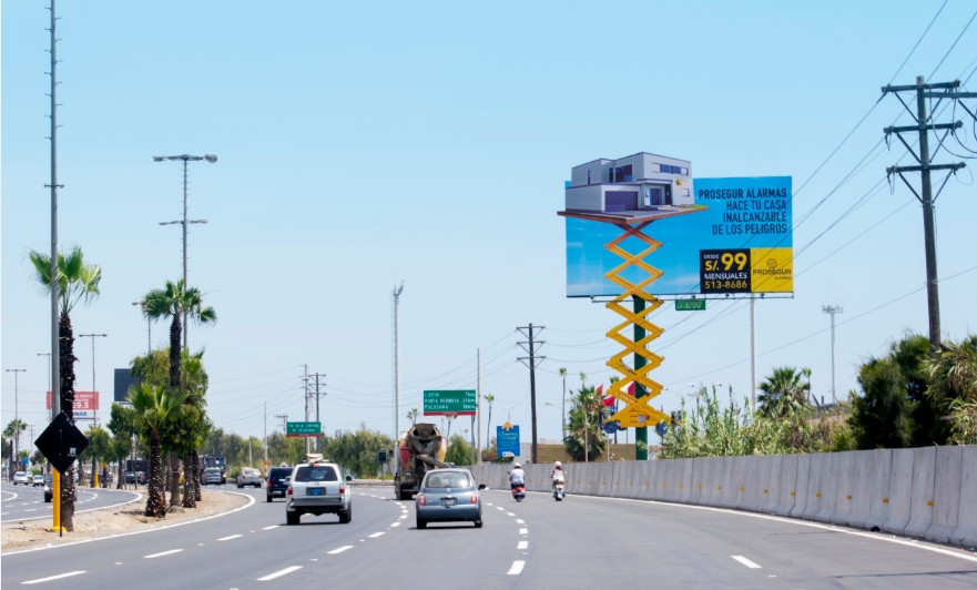 Es así como en el kilómetro 20 encontramos una elaborada producción de la empresa Prosegur, que representa la seguridad que ofrecen las alarmas de esta compañía: a través de simples elementos como una casa, que es elevada gracias a un resorte troquelado que abarca el mismo espacio que el soporte, se simula que esta vivienda se ubica en una zona segura e inalcanzable para el peligro. La divertida analogía de esta torre unipolar señala el beneficio del producto a través de este simple recurso. Encontramos este elemento ingeniado por la agencia creativa Cupido Publicidad una vez que se atraviesa el peaje.