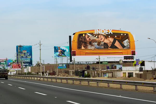 Por otro lado, la tienda Ripley apostó por presentar dos paneles distintos en esta carretera: en el kilómetro 37, encontramos un panel que simula ser la ventana posterior de un automóvil que cuenta con un espacio personalizado para la diversión juvenil, dando a conocer a través de esta implementación la marca de ropa INDEX; mientras que en el kilómetro 49 encontramos un panel monumental que presenta este establecimiento en Asia. Ambas producciones se gestionaron con la agencia de medios UM.
