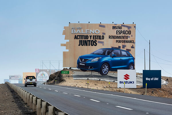 Asimismo, la compañía de automóviles Suzuki decidió presentar un panel monumental a la altura del kilómetro 77 de la Panamericana Sur. De esta manera, el modelo Baleno ocupa el espacio del panel monumental, mientras que el auto y la marca Suzuki con su eslogan “Way of Life!” ocupan espacios independientes adelante del panel principal. Esta campaña fue coordinada con la central de Medios Mediacom.